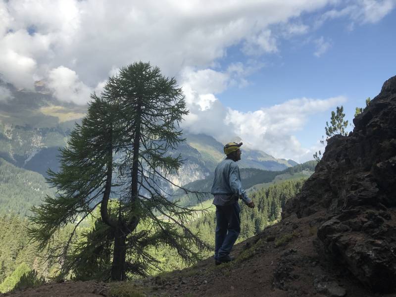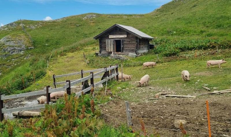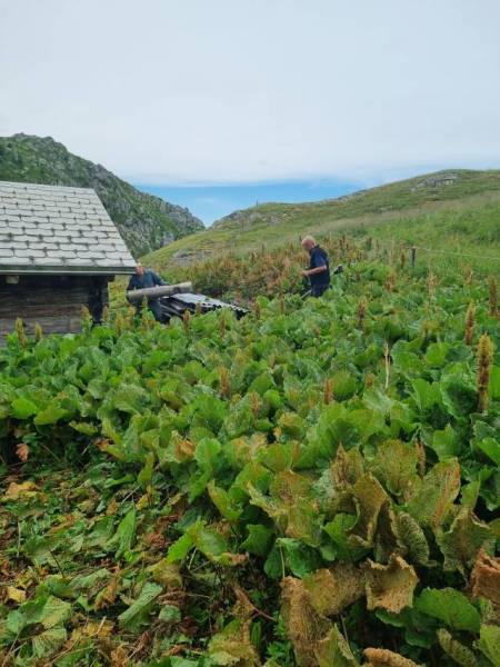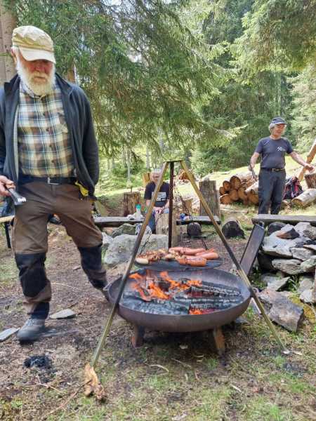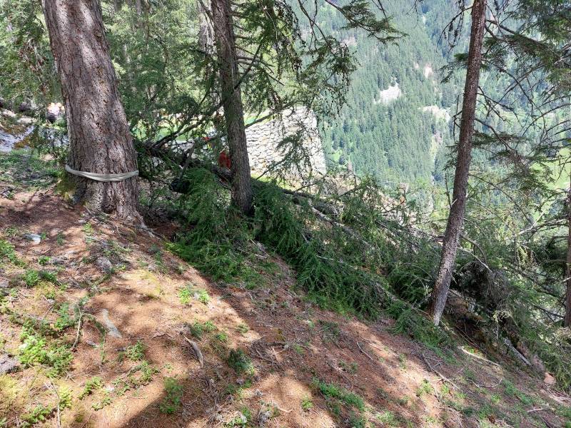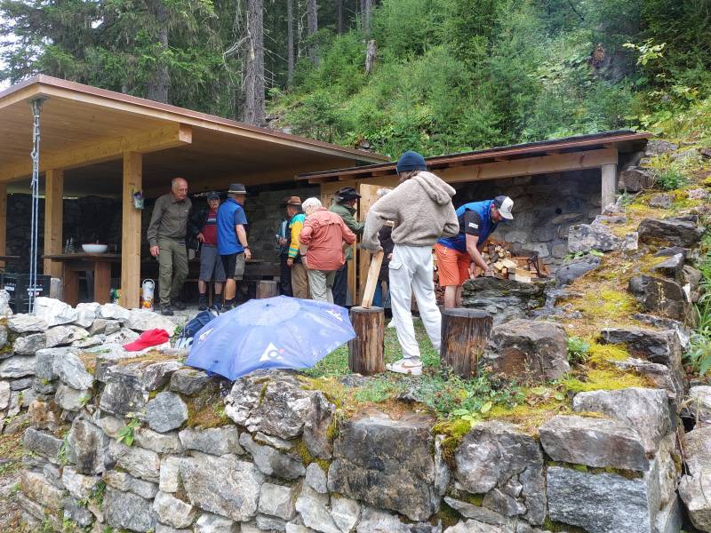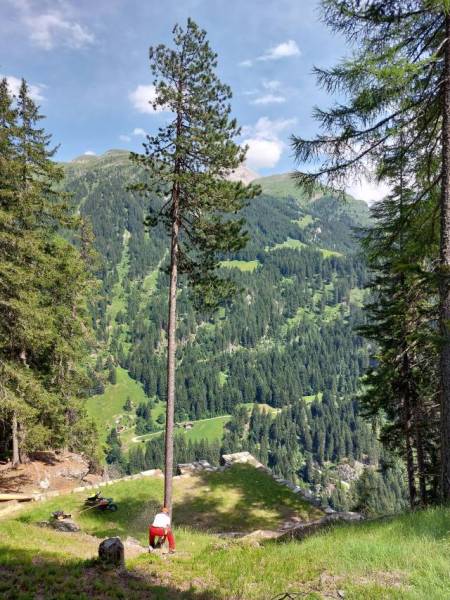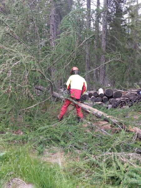 Die Freunde am Hinterrhein VEH riefen für Samstag 5.7. zu einem Frontag auf. Vier hüteten die Schweine auf Taspin. Nein, sie pflegten die Umgebung des Museumsstalls und die Einzäunung auf Tischatscha. Zu zweit fällten wir auf der Seilbahnplattform Gruba vier Bäume, so dass allenfalls ein Heli landen könnte. (Bilder Taspin Walter, Gruba Husu)