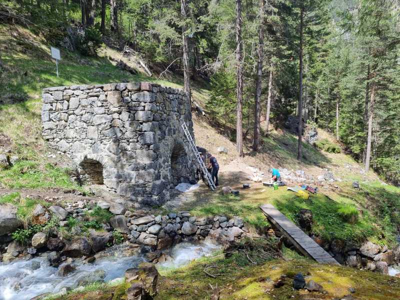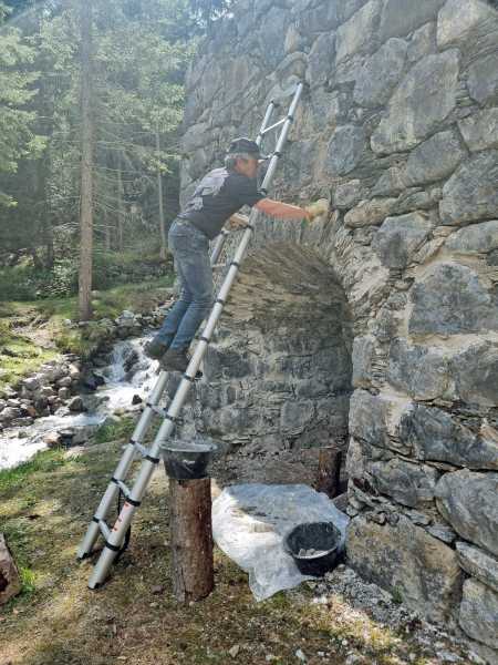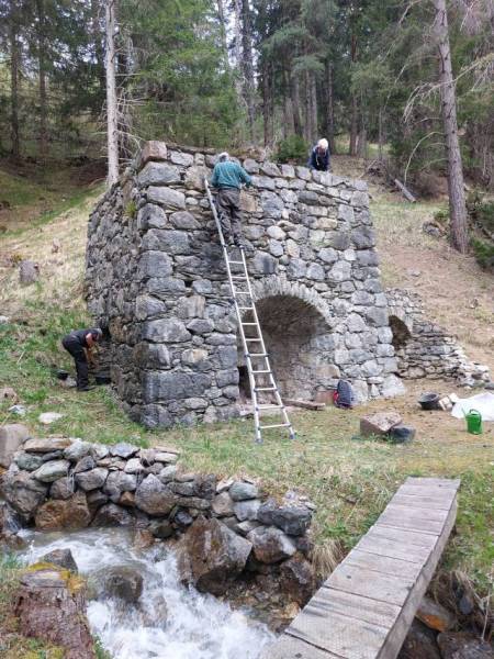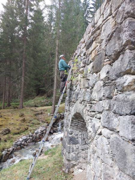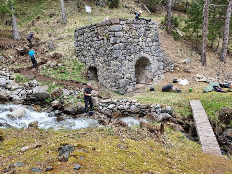 Das Bachufer wurde wieder gesichert, der Zugangsweg bachseitig um den Ofen geleitet und das Mauerwerk von Pflanzenwuchs gereinigt. Die dabei entstanden Ritzen sind nun am 2. Tag ausgefugt worden. (Bilder Andres und Husu)