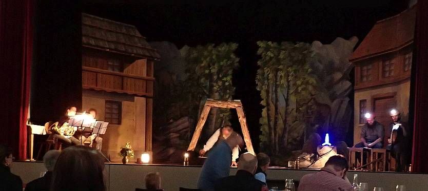 Unser FBG-Vorstandsmitglied Hansueli Suter ist nicht nur Bergknappe, sondern auch begeisterter Laienschauspieler. Als Ein-Mann-Theater führt er das Stück „Der Kampf der Geister mit den Bergknappen“ von Carl Theodor Körner auf (BK 123). Der Knappe mit Schlägel und Eisen, der Steiger mit dem Geleucht, der gewaltige Berggeist mit seiner Geisterschar, die Feen und die Feenkönigin, alle treten auf. Ein anderer Hut, eine Decke, eine Spitzenhaube mit Schleier oder sogar mit einem Krönlein, rasch ist die Verwandlung vollzogen. Der Knappe tut einen Gang auf. Die Berggeister türmen Felsen auf. Der Steiger ruft die andren Knappen zur Hilfe herbei. Die Mauer stürzt ein und der Berggeist entfacht das Feuer in der Tiefe. Es kracht und schon zieht roter Rauch durch den Bremsberg herauf. Man sieht das Feuer brennen. Doch die Feen der Quellen löschen die höllische Glut. Alles geht gut aus. Einzig die Sicht auf das Geschehen ist am Schluss stark eingetrübt. Der Schauspieler, die beiden Musiker und der Chor sind im Rauch und Dampf kaum mehr zu sehen. Nur langsam verzieht sich der Qualm. Grosser Applaus belohnt die mit viel Einsatz geleistete Vorstellung. Bevor es dann an den Abstieg zum Basisbahnhof und die Ausfahrt geht, wird man noch mit Nussgipfel und Kaffee verwöhnt.