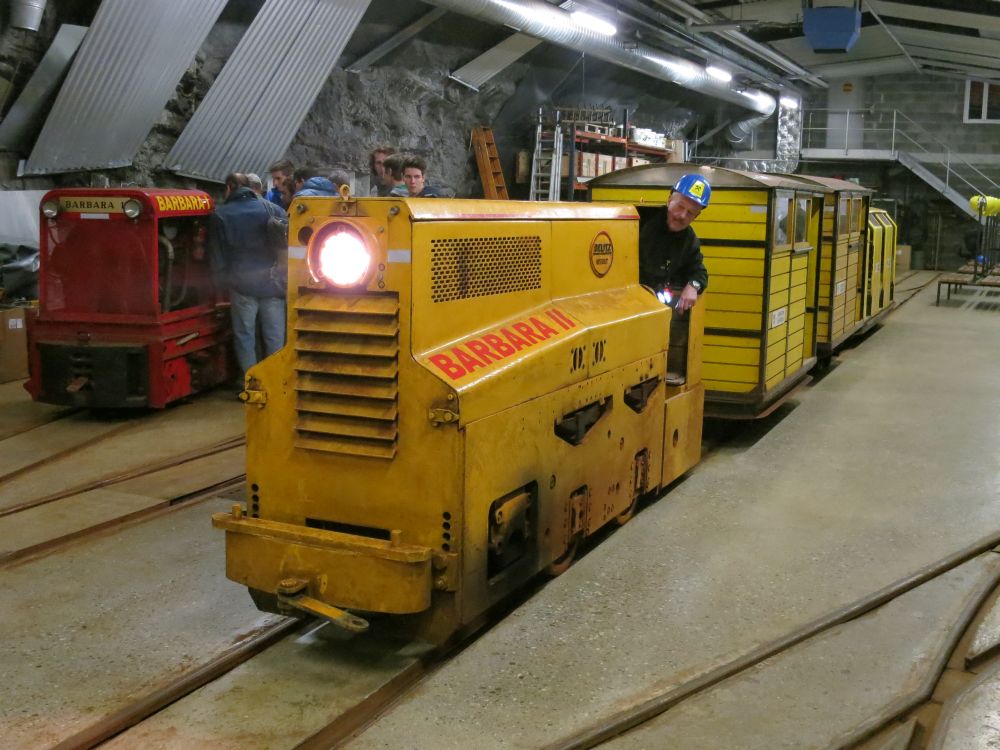 Dies ist auch nötig, denn der Berg ist durchlöchert von Stollen, Abbaufeldern und Schächten. Man könnte sich darin verirren. In vielen Stollen ist auch das Schienennetz noch vorhanden. Rollis stehen noch auf den Schienen. An der Firste sind tief eingeschnittene Runsen der Schrapperseile zu sehen. Mächtige Pfeiler, stehen gelassen beim Abbau, stützen die Firste in den Abbaufeldern. Das Auf- und Ab, das Marschieren durch die Stollen und das Fotografieren macht Hunger. Es ist Zeit für die Mittagspause tief im Berg Anschliessend folgt der kurze Abstieg bis zur Barbara und hier wartet eine Überraschung. Eine zweite Gruppe, welche direkt aufgestiegen ist, wartet schon. Mitten im Bremsberg ist ein neuer Türstock aufgestellt. Eine Trompete und eine Posaune werden ausgepackt. Eine kleine Gruppe Leute hat sich etwas abseits aufgestellt. Es ist der Chor, der sich bereit macht. Dann geht es los.