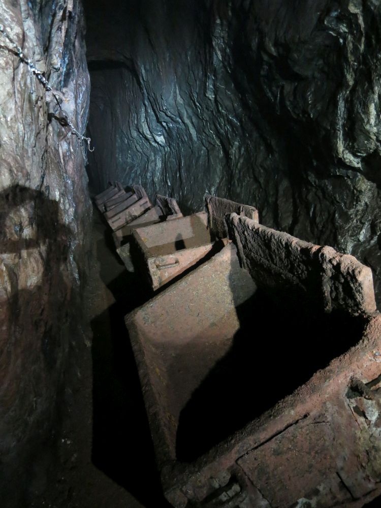 (JR) Es ist doch immer wieder etwas Besonderes, wenn man im Gonzenbergwerk ankommt, sich für die Einfahrt bereit macht und im Hintergrund schon den Dieselmotor der grünen Lokomotive Barbara IV klopfen hört. Bald steht der Zug bereit. Die Wagen sind eng und keineswegs komfortabel aber so sind vor Jahren auch die Arbeiter zur Schicht eingefahren. Heute, am 30. Dezember 2016 ist es eine besondere Schicht, die einfährt. Die Wagen sind besetzt. Punkt 09.00 h zieht die Lok an und bald schon rumpelt der Zug durch den dunklen Stollen bis zum Basisbahnhof. Es ist eine grosse Gruppe Leute, die an der diesjährigen Silvesterführung teilnehmen. Vor allem sind es Mitglieder der Knappen-Vereinigung Gonzenbergwerk aber auch zugewandte Orte oder Doppelmitglieder vom FBG oder aus Käpfnach lassen sich heute wieder einmal durch die Geheimnisse des Gonzen führen. Vorbei am ersoffenen Fluhwandgesenk geht es bald mehr oder weniger steil in die Höhe. Immer wieder ist ein Bremsberg zu ersteigen. Dabei sind die zum Teil neu eingebauten Treppenstufen äusserst hilfreich. Rico und Felix, die beiden Führer kennen sich aus und wissen Bescheid.